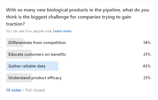 A poll we conducted on LinkedIn recently highlighted this challenge. 43% of respondents cited gathering reliable data as the biggest hurdle for companies trying to gain traction with new biological products. This reinforces the idea that while innovation is booming, the lack of focused, data-supported positioning is holding many products back.